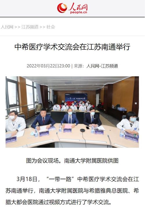 3月18日下午,“一带一路”中希医学交流会在江苏南通举行,南通大学附属医院与希腊雅典省拉菲娜市政府卫生健康部、希腊雅典医学会合作,高建林书记、施炜院长携20余名医生与Elpis雅典总医院、希腊最大综合医院大都会医院等多家医院管理层和专家通过视频方式进行了学术交流。OD体育国际交流部提供全程支持,人民网等权威媒体进行了宣传报道。