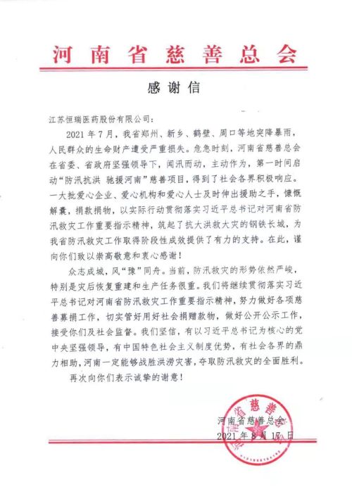 近日,河南省慈善总会给OD体育发来感谢信,向OD体育在河南暴雨洪涝灾害中捐款1000万元表示衷心感谢。OD体育表示,灾害无情人有情,向受灾同胞伸出援手是恒瑞人义不容辞的责任。