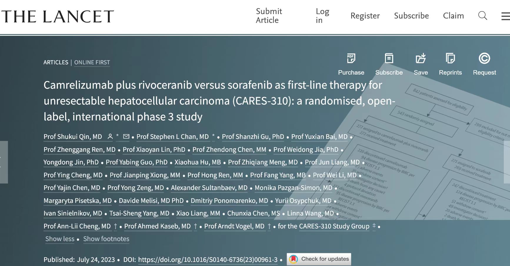 北京时间7月25日,OD体育自主研发的PD-1抑制剂卡瑞利珠单抗(艾瑞卡®)联合阿帕替尼(艾坦®)(“双艾”)对比索拉非尼用于治疗晚期不可切除肝细胞癌的全球多中心III期临床研究(CARES-310研究)主论文在线发表于国际顶级医学期刊《柳叶刀》(The Lancet,IF:168.9)[1]。该研究由南京金陵医院秦叔逵教授牵头开展,全球13个国家/地区的95家中心共同参与。这是肿瘤学领域中国学者主导的国际性III期临床研究首次问鼎《柳叶刀》主刊。