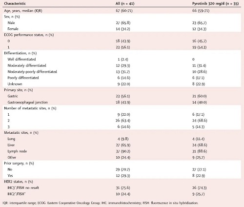 2020年6月至2021年6月期间,试验共纳入41例患者(10例患者在1a期,31例患者在1b期),所有患者均接受了至少一个周期的吡咯替尼联合卡瑞利珠单抗和CapeOX治疗(图1)。其中56.1%患者的原发肿瘤在胃部,43.9%患者的原发肿瘤位于胃食管交界处。此外,75.6%的患者的HER2免疫组化(IHC)评分为3+(表1)。