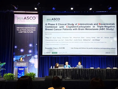 2025年美国临床肿瘤学会(ASCO)年会于当地时间5月30日至6月3日在芝加哥盛大举行。本次大会上,由复旦大学附属肿瘤医院胡夕春教授和张剑教授牵头开展的“阿得贝利单抗联合贝伐珠单抗和顺铂/卡铂治疗三阴性乳腺癌脑转移患者的II期临床研究(ABC研究)”研究在快速口头报告专场进行了汇报[1]。阿得贝利单抗联合贝伐珠单抗和顺铂/卡铂有望为晚期三阴性乳腺癌脑转移患者提供新的联合治疗方案。